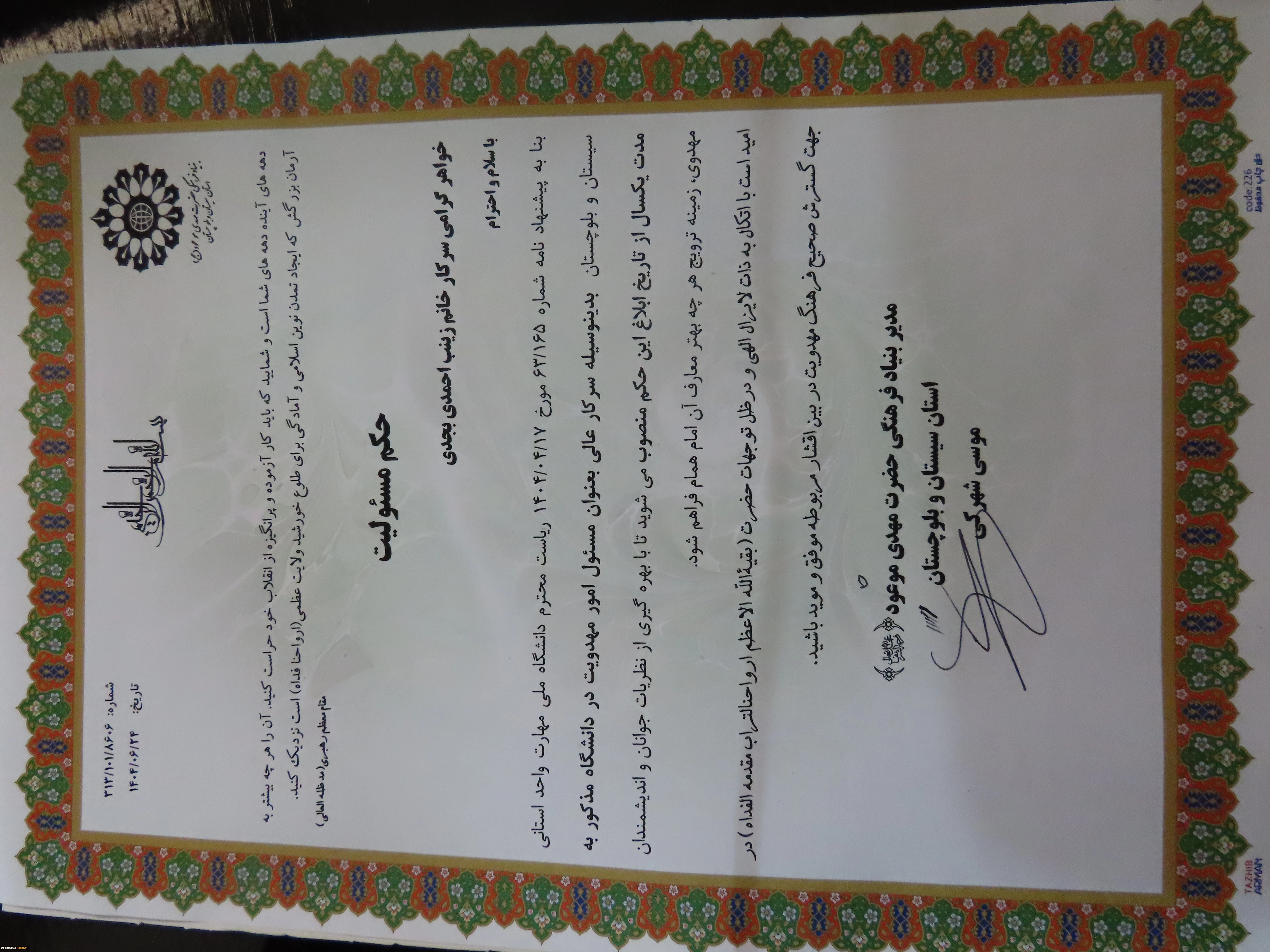 مسئول امور مهدویت  آموزشکده شهید باهنر زاهدان واحد استانی سیستان و بلوچستان معرفی شد. 6