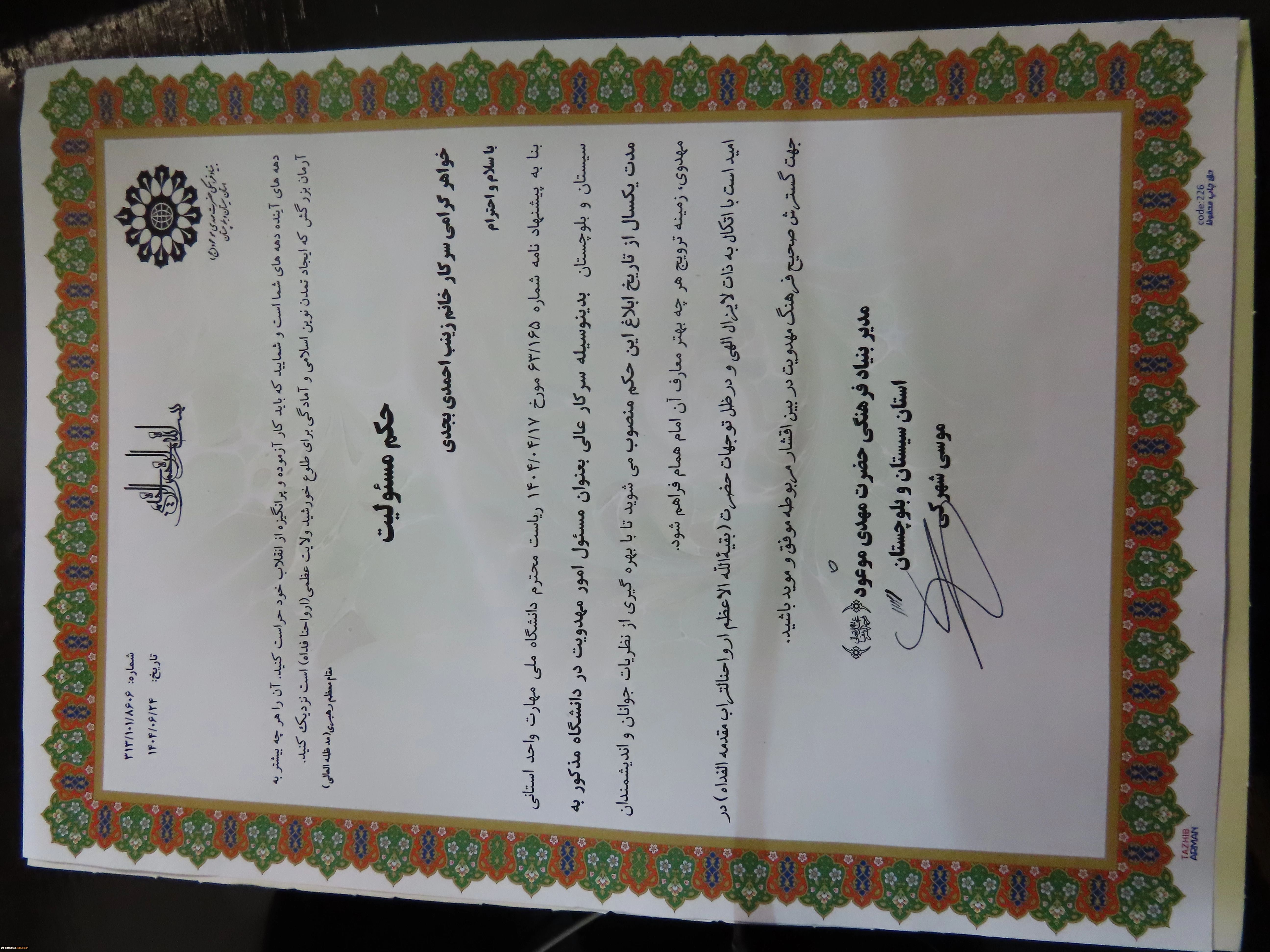 امتیاز دهید : مسئول امور مهدویت آموزشکده شهید باهنر زاهدان واحد استانی سیستان و بلوچستان معرفی شد. 6 سهشنبه 25 شهریور 1404 ساعت 9:25