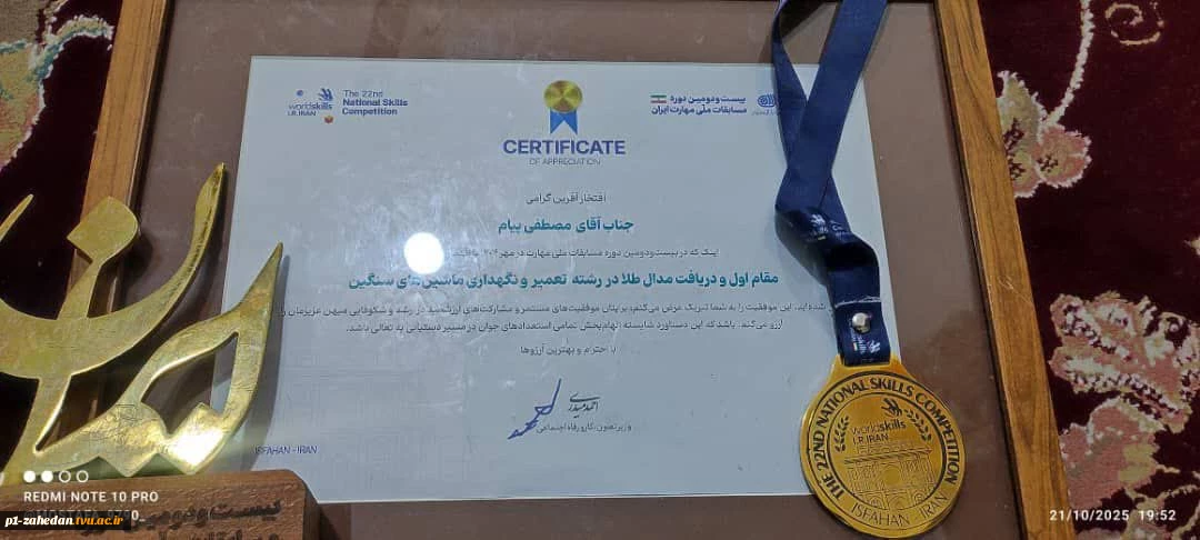 افتخار آفرینی دانشجوی آموزشکده پسران شماره یک زاهدان (شهید باهنر) - واحد استانی سیستان وبلوچستان در بیست‌و‌دومین جشنواره ملی مهارت کشور 2